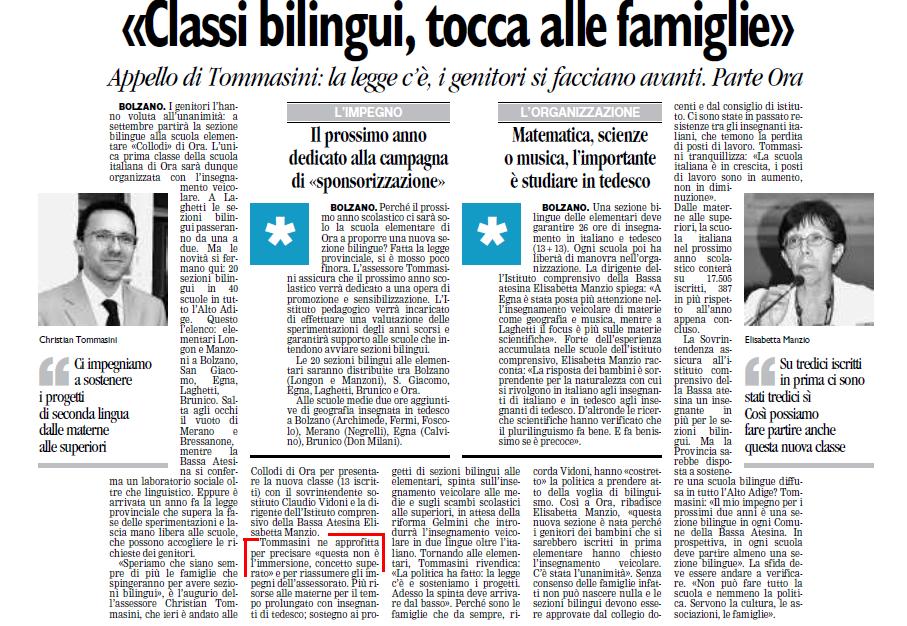 Si legge sul quotidiano: “Tommasini, che ieri è andato alle Collodi di Ora per presentare la nuova classe (13 iscritti) con il Sovrintendente sostituto Claudio Vidoni e la dirigente dell’Istituto comprensivo della Bassa Atesina Elisabetta Manzio ne approfitta per precisare «questa non è l’immersione, concetto superato»”